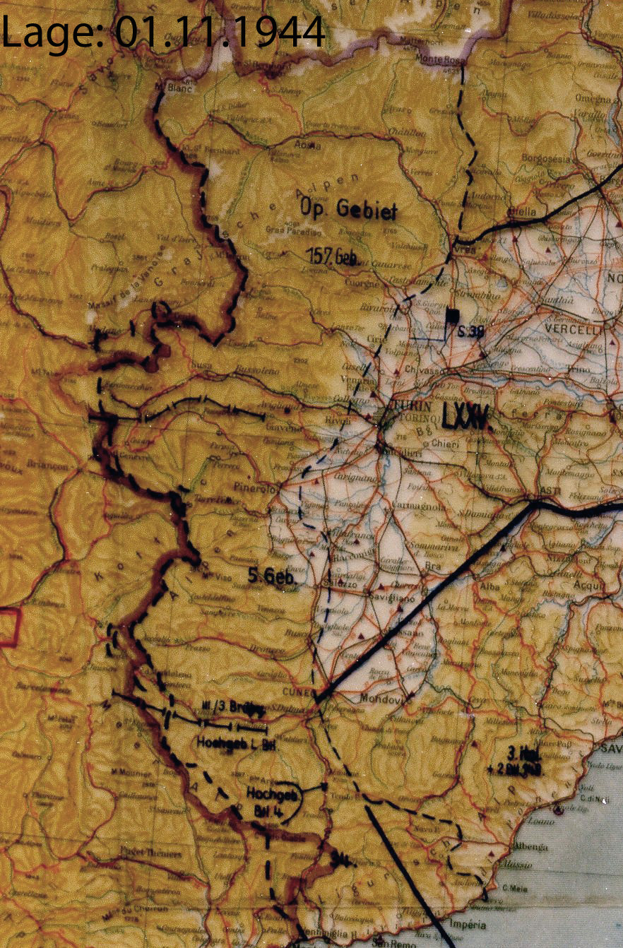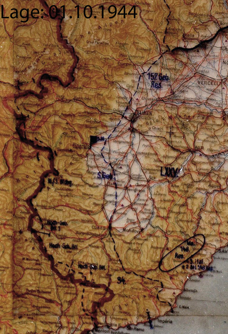 Heeres-Küsten-Artillerie-Regiments-Stab West Gebirgs-Beobachtungs-Batterie 52 1 Kp. / Pionier-Bataillon 60 Bau-Pionier-Bataillon 821 Festungs-Pionier-Abschnitts-Gruppe II. / 14 Landesschützen-Bataillon 685 Infanterie-Regiments-Stab z.b.V. "Meeralpen" selbständige Panzer-Kompanie "Ligurien" Sicherungs-Regiments-Stab 38 |