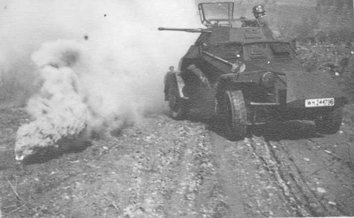 | Soldaten der Abteilung vor einer Übung. | Ein Sd.Kfz. 222 bei einer Übung. Im Vordergrund eine Nebelkerze. |