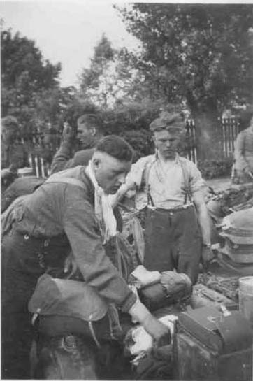| Ein Melde-Krad des Regiments. | Rast und technischer Dienst. |