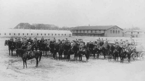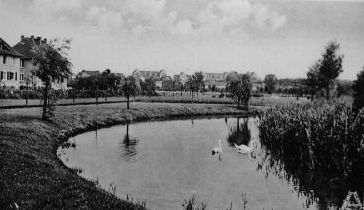 Park mit Schwänen; Im Hintergrund sind die Fuchsberg-Kasernen zu erkennen 1937 |