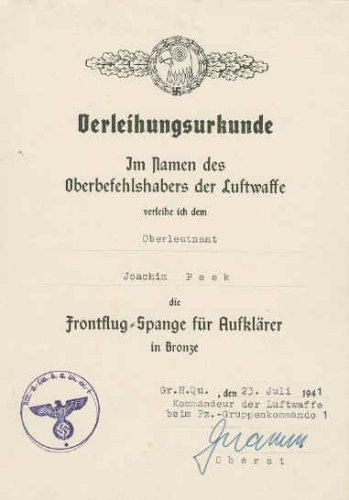 "Aufklärungsflüge mit einmotorigen Flugzeugen (Jagdaufklärer), die über See in Räume geführt haben, die von der eigenen Küste mindestens 400 km entfernt sind, können ungeachtet der Flugdauer, mit oder ohne Luftfeindberührung, für die Verleihung der Frontflugspange zweifach in Anrechnung gebracht werden."1