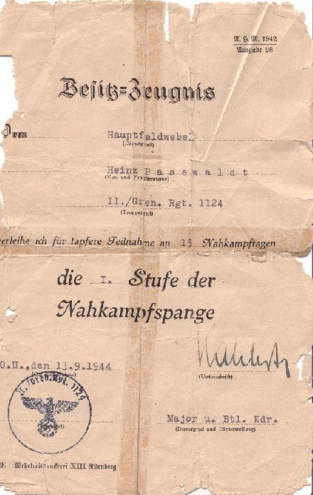 "Der Führer hat sich die Aushändigung der goldenen Nahkampspange als der höchsten infanteristischen Auszeichnung vorbehalten. Soldaten, die die Bedingungen (50 Nahkämpfe) erfüllt haben, sind durch die verleihungsberechtigten Kommandeure dem O. K. H./Pa auf dem Dienstweg namhaft zu machen. Hierzu ist eine Abschrift des Verleihungsantrages für die 3. Stufe der Nahkampfspange, auf der die Verleihung durch den betreffenden Kommandeur bescheinigt sein muss, vorzulegen. Der Zeitpunkt der Meldung beim Führer wird über die Heeresgruppe befohlen. Erneut wird darauf hingewiesen, dass bei der Anrechnung der Nahkampfspange - entsprechen der Stiftungsverordnung des Führers - ein besonders scharfer Maßstab anzulegen ist, um den hohen Wert der Nahkampfspange zu erhalten."4