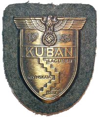 Artikel 3 (1) Der Kubanschild wird verliehen als Kampfabzeichen an alle Wehrmachtangehörigen und der Wehrmacht unterstellten Personen, die seit 1. Februar 1943 an den Kämpfen am Kubanbrücken- kopf zu Lande, in der Luft oder zu Wasser ehrenvoll beteiligt waren. (2) Die Verleihung vollzieht in meinem Namen Generalfeldmarschall von Kleist.