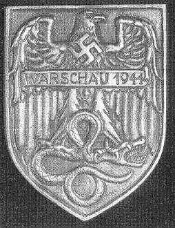 Artikel 3 (1) Der Warschauschild wird verliehen als Kampfabzeichen an Wehrmachtangehörige und Nicht- wehrmachtangehörige, die in der Zeit vom 1. August 1944 bis Oktober 1944 an den Kämpfen in Warschau ehrenvoll beteiligt waren. (2) Die Verleihung vollzieht in meinem Namen SS-Obergruppenführer und General der Polizei von dem Bach.
