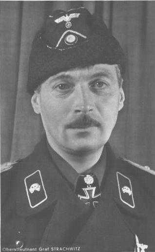 Der aus einem oberschlesischen Adelsgeschlecht stammende Graf Strachwitz trat bereits vor dem Ersten Weltkrieg in das kaiserlich-preußische Kavalleriekorps ein. Als Leutnant im berittenen Garderegiment "Garde du Corps" zog er 1914 in den Krieg gegen Frankreich. Doch für den verwegenen jungen Offizier war dieser Krieg nur von kurzer Dauer. Im September 1914 geriet er während eines Spähunternehmens in französische Gefangenschaft, für Tapferkeit im Gefecht hatte er jedoch in dieser kurzen Zeit bereits das Eiserne Kreuz 1. Klasse erhalten. Nach dem Ende des I. Weltkriegs kam er 1919 aus der französischen Kriegsgefangenschaft schwer krank über die Schweiz nach Berlin. Dort kam er zu der Kavalleriedivision und wurde u.a. für mehrere Wochen bei den Unruhen eingesetzt. Am 22. Juli 1919 heiratete er die Gräfin Sauerma, mit der er später noch drei Kinder bekam. Im März 1920 wurde er als Oberleutnant der Reserve aus der Armee entlassen und ging zurück nach Oberschlesien, wo er als selbständiger Land- und Forstwirt tätig war. In den Jahren 1920/21 kämpfte Graf Strachwitz in den Freikorps "von Hülsen" und "Schweidnitz" erfolgreich gegen polnische Freischärler in Schlesien. In den Zwanziger- und Dreißigerjahren war der Gutsverwalter als Rittmeister der Reserve im Reiterregiment 7 in Breslau gelistet. Im Jahr 1931 reiste er nach München, wo er in die NSDAP eintrat. Im November 1932 kam er zur 23. SS-Standarte nach Oppeln. In den Jahren 1935 und 1936 leistete er als Hauptmann der Reserve in der Wehrmacht drei Reserveübungen von jeweils einem Monat. 1935 wechselte Strachwitz - von seinen Freunden Conté genannt - als Reserveoffizier ins Panzerregiment 2 in Eisenach. Der Reiterveteran aus dem Ersten Weltkrieg zeigte sich von der neuen Waffengattung begeistert. Als im September 1939 der Zweite Weltkrieg ausbrach, erhielt Strachwitz den Posten eines Divisions-Nachschuboffiziers. Trotzdem nahm er selbständig an Gefechten teil und erhielt in Anerkennung seiner Verdienste die Spangen zum Eisernen Kreuz 1914 (1939 Spange zum EK II, 1940 Spange zum EK I) verliehen.