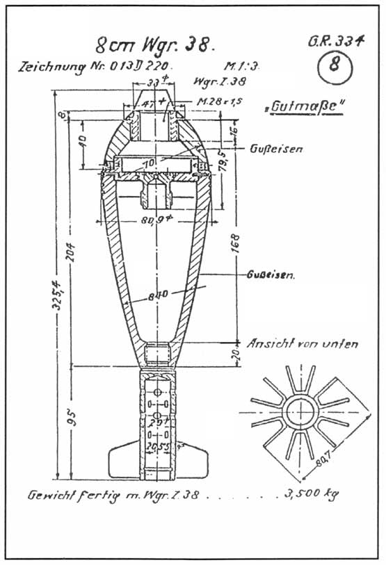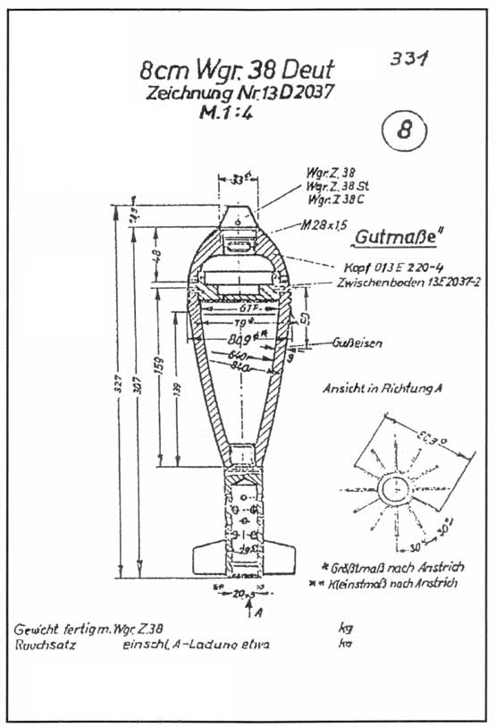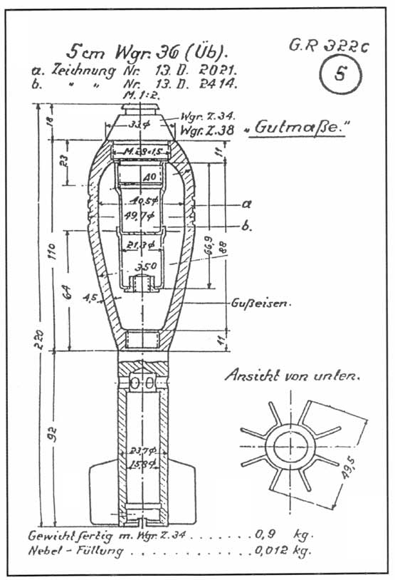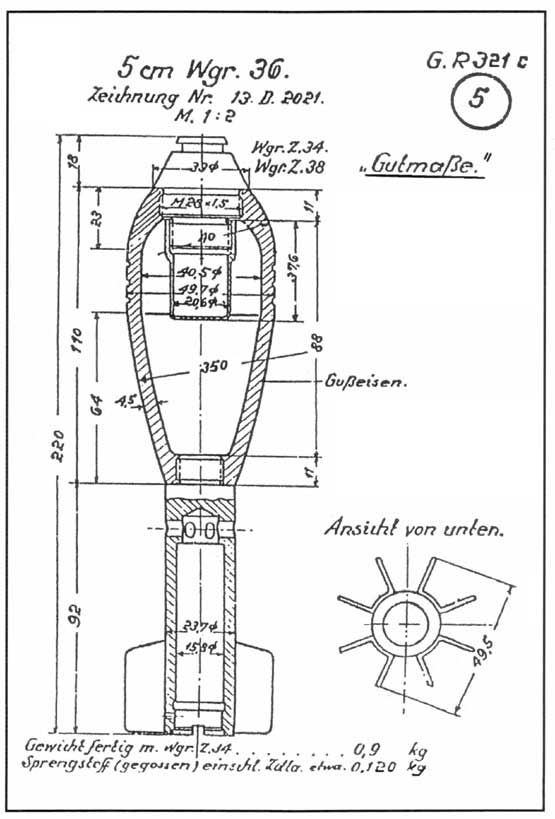 - die 21-cm Wurfgranate 5031 (Grauguß) gegen lebende Ziele und zum Durchschlagen von Deckungen.