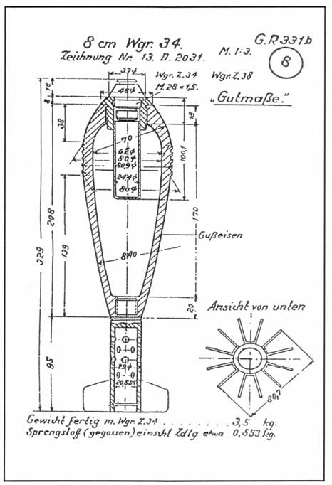Ab 1932 entwickelte die Firma Rheinmetall den 8-cm-Granatwerfer (Gr.W.) 34. Die Waffe war ein glatter Vorderlader mit einem Gewicht von 57 kg. Er bestand aus dem Rohr mit Verschlußkappe, Zweibein mit Richtmaschinen und Einkipptrieb und der Bodenplatte sowie dem Richtaufsatz. Das Rohr war 1.143 mm lang und hatte ein Kaliber von 81,4 mm. Bei einer v0 von 172 m/Sek. wurde die 3,5 kg schwere Wurfgranate 34 bis zu 2.400 m weit geschossen. Die Streuung bei der maximalen Reichweite lag bei 65 m. Die ersten Waffen hatte die Truppe 1937 erhalten. Bei Kriegsausbruch verfügte sie über 3.625 Stück. Wenn die Waffe auf Selbstfahrlafetten montiert war (z.B. Sd.Kfz. 250/7), wurde sie Granatwerfer 67 genannt.