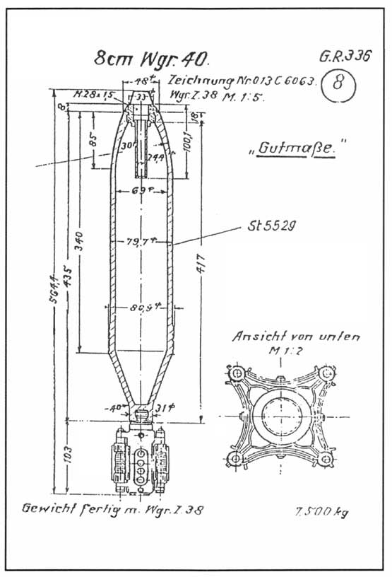 - 12-cm Wurfgranate 42 zur Bekämpfung lebender Ziele und leichter Deckung mit einem gewicht von 15,8 kg.
